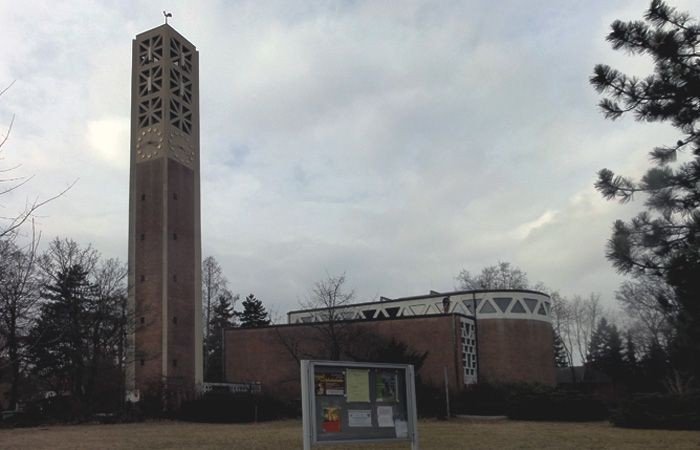 Von außen betrachtet ist unsere Kirche schmucklos. Sie setzt jedoch einen städtebaulichen Akzent. Das Gelände wird oft als „Tor zu Eberstadt“ bezeichnet. In der Tat fällt der wuchtige Backsteinbau (in Wahrheit sind die tragenden Elemente aus Stahlbeton) jedem Betrachter auf, der die Heidelberger Landstraße passiert. Der Turm – als Campanile damals häufig gebaut – steht in der Sichtachse der Katharinenstraße (damals die B 3) und der noch nicht errichteten, aber schon lange geplanten Reuterallee. Die Kirche schützt gleichsam das Gemeindegelände und lädt gleichzeitig ein, es zu betreten. Innen wirkt sie ebenfalls schmucklos – zumindest auf den ersten Blick. Dies ist aber erklärte Absicht des Architekten Fritz Soeder. Nichts soll die Gläubigen von der Andacht abhalten. Zunächst waren noch Fenster an den Seitenwänden geplant, gebaut wurden aber glatte Wände. Das Licht sollte indirekt von oben durch die Lichtbandfenster kommen – und von den Bildfenstern. Diese waren zu Beginn noch gar nicht eingeplant, zumindest nicht in der heutigen Form. So ist es ein Glück, dass der Bildkünstler Helmuth Uhrig den Auftrag zur Gestaltung des Innenraumes bekam.